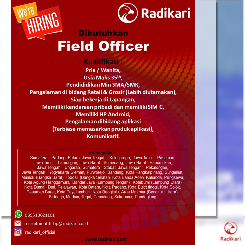 Pria / Wanita, Usia Maks 35th, Siap bekerja di Lapangan, Memiliki kendaraan pribadi dan memiliki SIM C, Pendididikan Min SMA/SMK, Pengalaman di bidang Retail & Grosir (Lebih diutamakan), Memiliki HP Android, Pengalaman dibidang aplikasi (Terbiasa memasarkan produk aplikasi), Komunikatif.