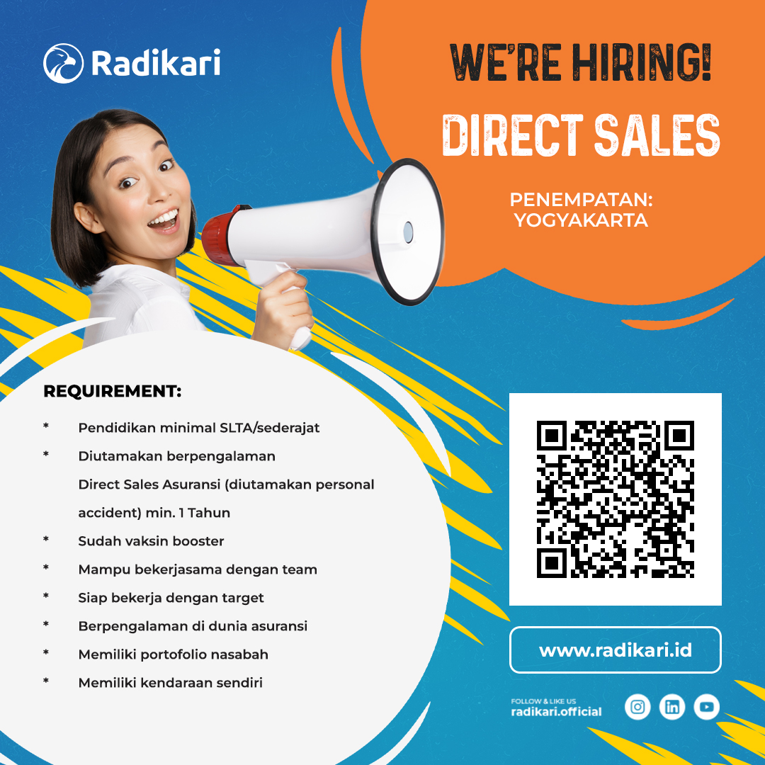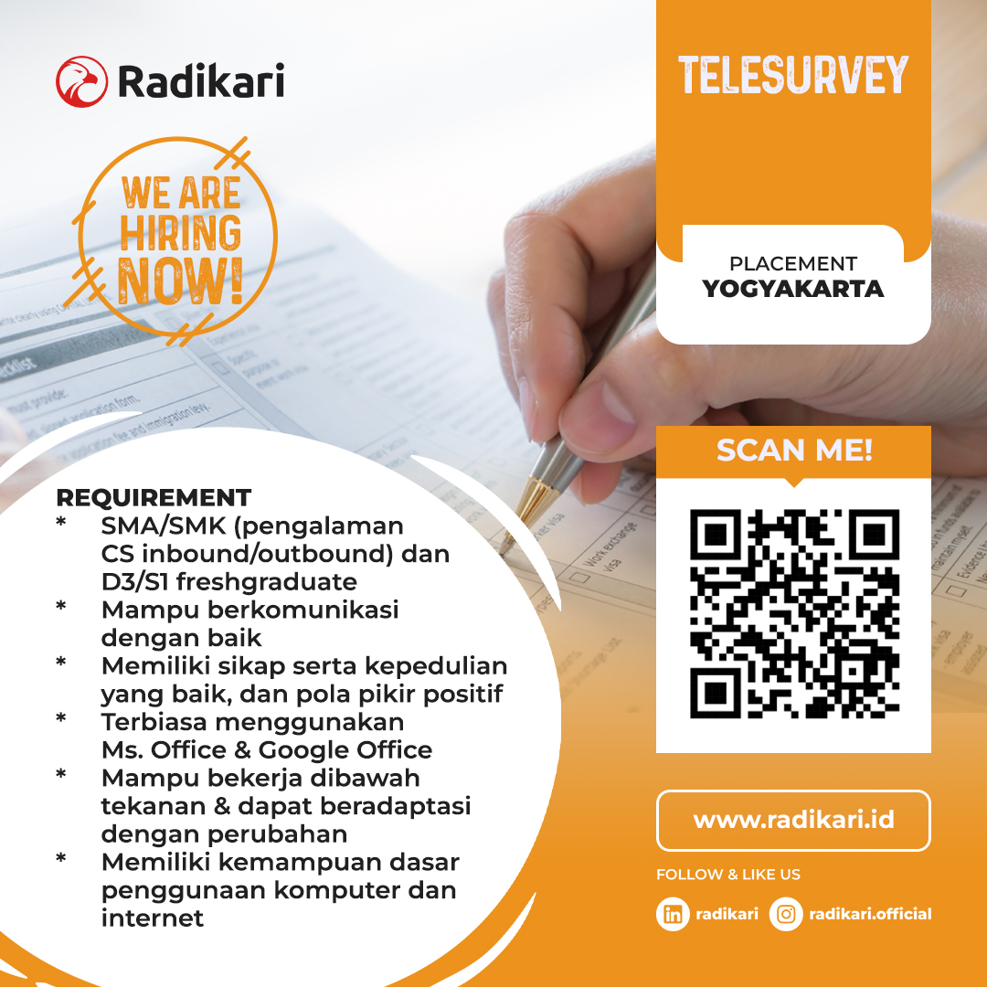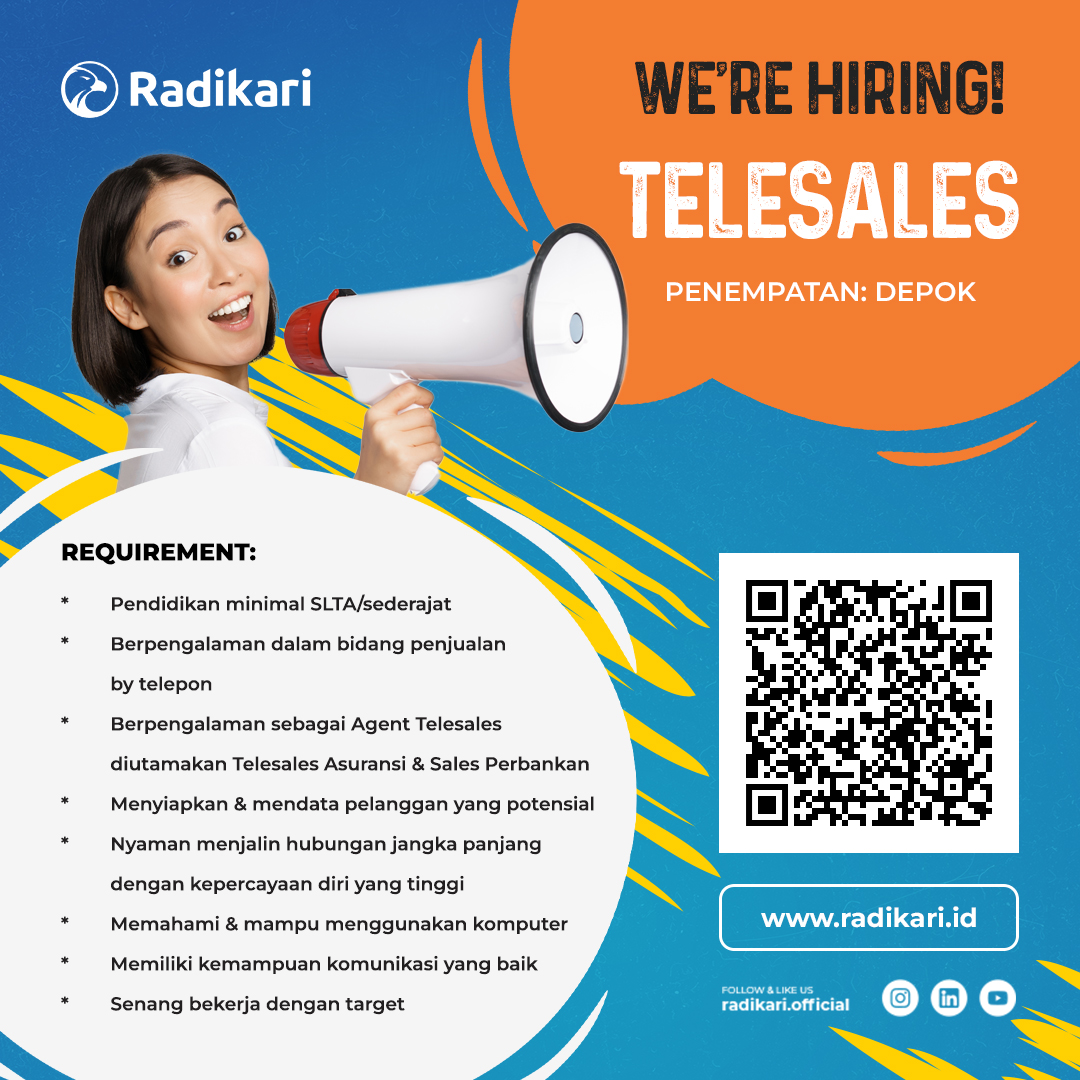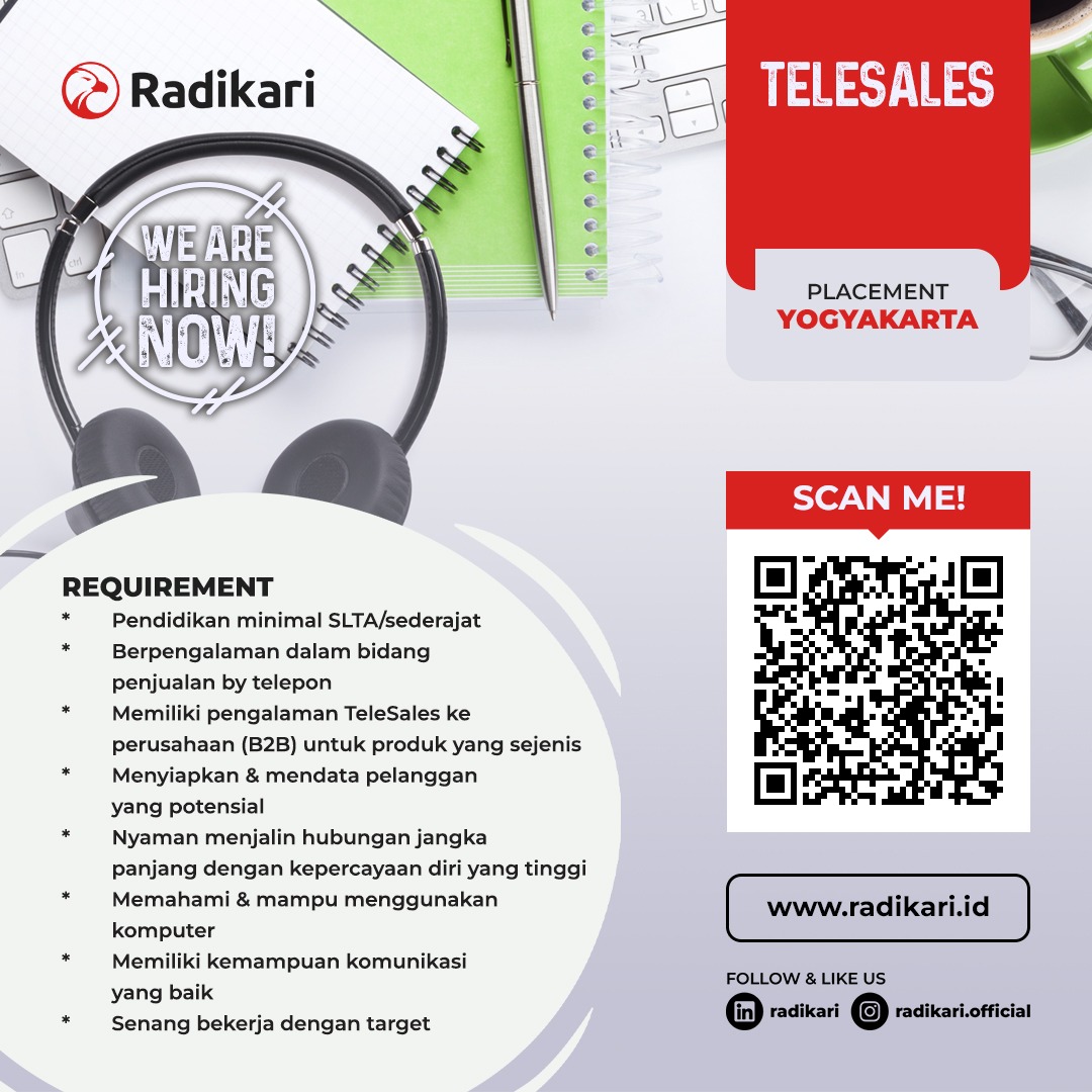 Kualifikasi : 1. SMA sederajat dengan pengalaman telesales atau sejenis; 2. Mampu berkomunikasi dengan baik, Memiliki sikap serta kepedulian yang baik, dan pola pikir yang positif; 3. Terbiasa menggunakan Microsoft Office dan Google Office; 4. Mampu bekerja dibawah tekanan dan dapat beradaptasi dengan perubahan; 5. Dapat bergabung secepatnya.