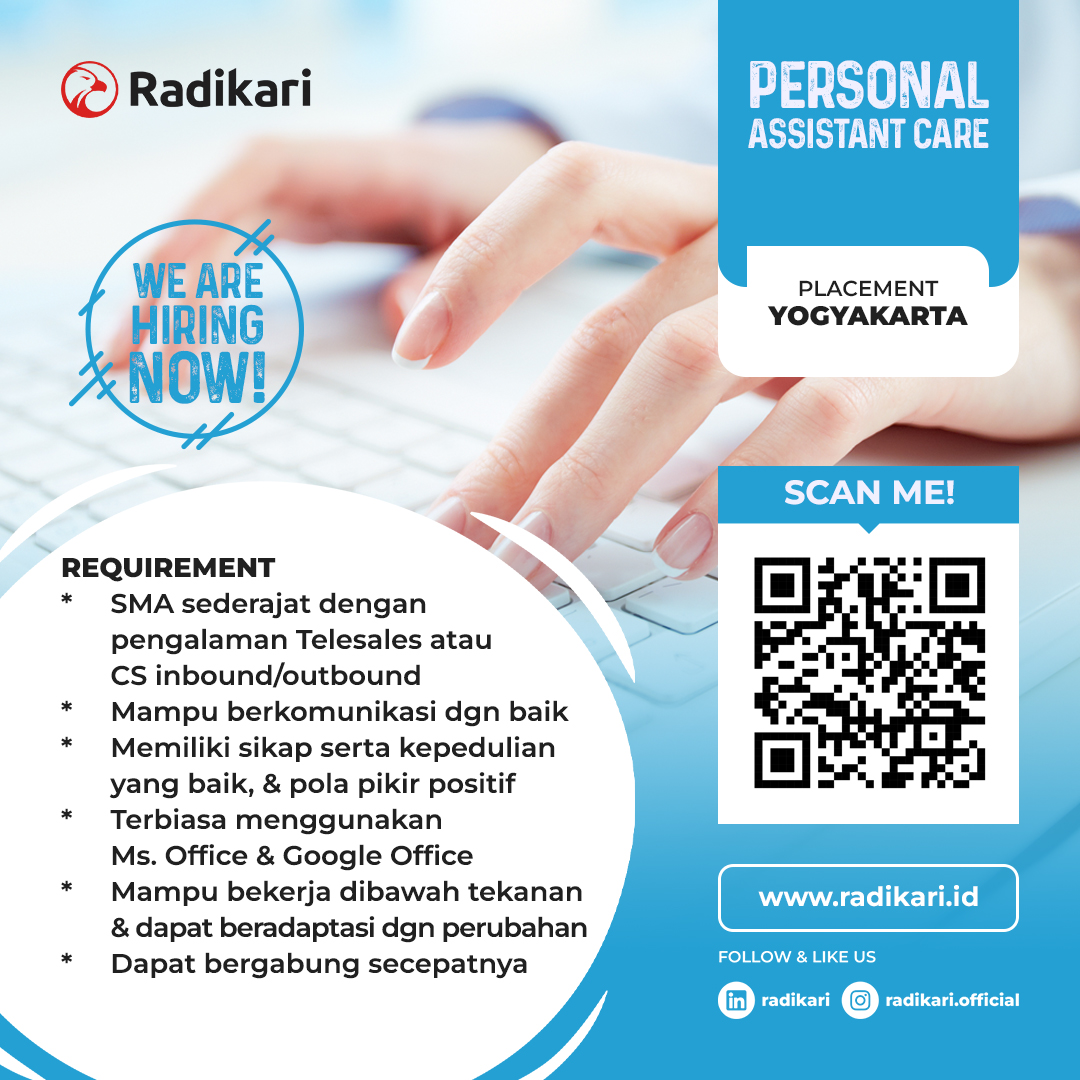 Kualifikasi : 1. SMA sederajat dengan pengalaman telesales atau sejenis; 2. Mampu berkomunikasi dengan baik, Memiliki sikap serta kepedulian yang baik, dan pola pikir yang positif; 3. Terbiasa menggunakan Microsoft Office dan Google Office; 4. Mampu bekerja dibawah tekanan dan dapat beradaptasi dengan perubahan; 5. Dapat bergabung secepatnya.